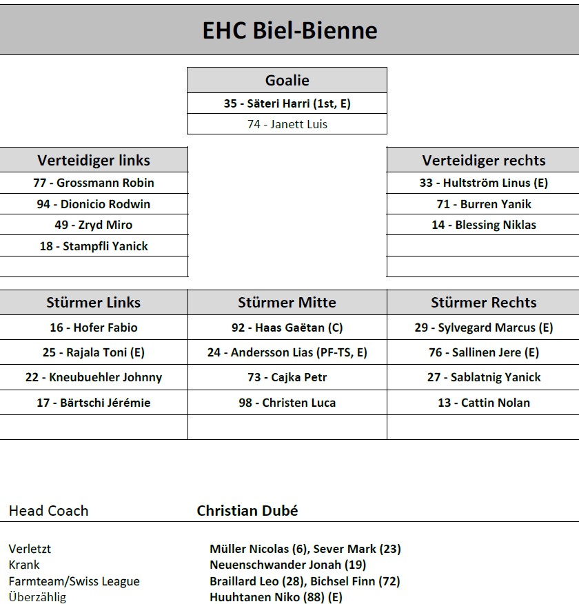 Aufstellung EHC Biel-Bienne