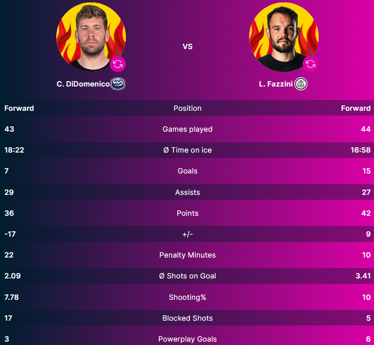 Auf Seiten des Heimteams trägt Christopher Didomenico den Flammenhelm. Der Kanadier hat bisher mit 7 Toren und 29 Assists 36 Scorer gesammelt. Beim Gast aus Lugano hat Luca Fazzini mit 15 Toren und 27 Assists insgesamt 42 Scorerpunkte zu Buche stehen.